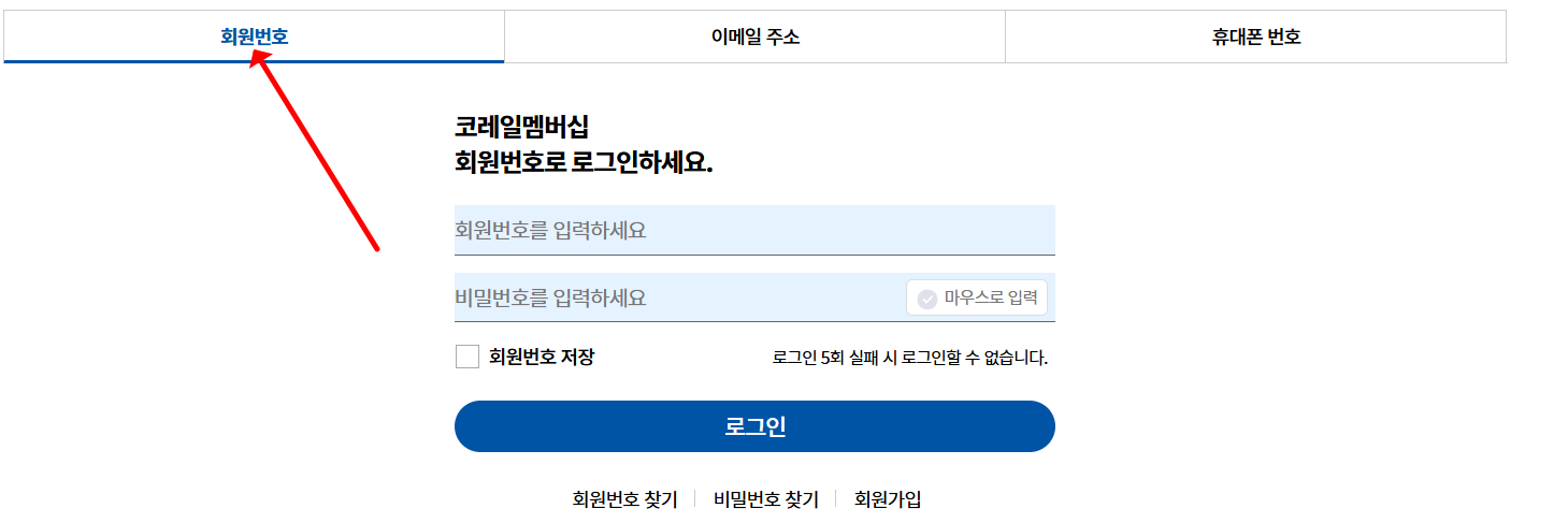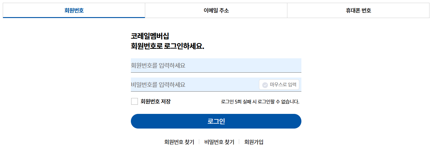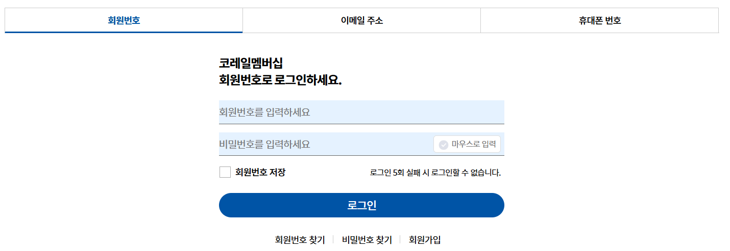 | 회원번호 로그인 | 가입 시 발급된 숫자형 회원번호와 비밀번호 입력 |